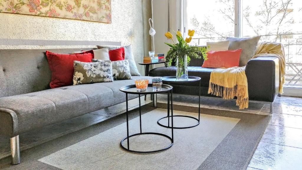 Die Wohnung umfasst drei Schlafzimmer sowie zwei Badezimmer, die jeweils mit Bidets und kostenlosen Pflegeprodukten ausgestattet sind. Die voll ausgestattete Küche beinhaltet unter anderem einen Backofen, Geschirrspüler, Herdplatte, Kühlschrank, Mikrowelle, Toaster sowie Kaffee- und Teezubereitungsmöglichkeiten. Weitere Ausstattungsmerkmale sind individuell regulierbare Klimaanlagen in jedem Raum, Heizung, schallisolierte Zimmer mit Fliesenboden sowie Bügelmöglichkeiten inklusive Bügeleisen und -brett. Bettwäsche und Handtücher werden bereitgestellt, Sitzbereiche sind möbliert mit Sofas und Schreibtischen.