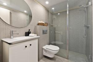 Koupelna nabízí zdarma toaletní potřeby včetně šamponu a kondicionéru oraz sprchový kout pro větší komfort. Další vybavení zahrnuje žehlící potřeby se žehličkou a prkénkem, ručníky dodané společně s ložním prádlem, k dispozici jsou také pračka a prostor na odkládání věcí v šatní skříni či skříňce, dětská postýlka doplňuje tento dobře zařízený apartmán.