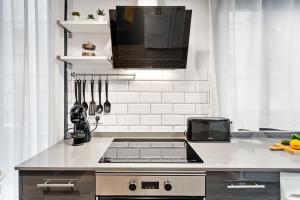 W tym samodzielnym apartamencie znajduje się jedna sypialnia wyposażona w jedno łóżko oraz część wypoczynkową i szafę na ubrania. Aneks kuchenny jest w pełni wyposażony - posiada piekarnik, mikrofalówkę, lodówkę, ekspres do kawy, toster, czajnik elektryczny oraz kompletny zestaw naczyń umożliwiający komfortowe przygotowywanie posiłków. Dodatkowo dostępne są ogrzewanie oraz sprzęt do prasowania obejmujący żelazko i deskę do prasowania wraz ze stojakiem na suszenie ubrań.