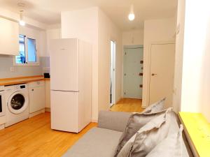 The accommodation includes air conditioning, a washing machine, towels and bed linen for added comfort. The bathroom comprises a toilet and shower while the living space features a sofa bed for additional sleeping arrangements.