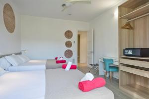 Cada apartamento dispone de aire acondicionado e incluye tres o cuatro dormitorios según la unidad, con camas configurables como individuales o dobles. Los huéspedes disfrutan de dos baños modernos equipados con bañeras, duchas, bidés y secadores de pelo. Las zonas comunes cuentan con televisores LED junto con sofás cama dobles para opciones adicionales para dormir. Las cocinas americanas están totalmente equipadas con microondas, hornos, placas cerámicas y lavadoras.