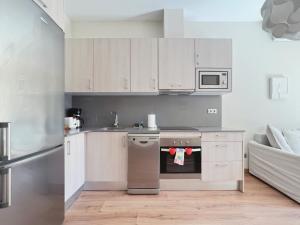 Das Apartment umfasst ein Schlafzimmer sowie ein separates Wohnzimmer mit zwei Betten, darunter ein Schlafsofa. Die voll ausgestattete Küche verfügt über Backofen, Kochfeld, Kühlschrank, Geschirrspüler, Mikrowelle, Toaster, Kaffeemaschine und Wasserkocher sowie Küchenutensilien und einen Esstisch. Das Badezimmer ist mit Dusche und Badewanne ausgestattet und bietet Shampoo, Duschgel, Bidet sowie Haartrockner. Weitere Annehmlichkeiten sind Klimaanlage (Kühlen/Heizen), Bügeleisen mit Bügelbrett, Waschmaschine mit Wäscheständer, Handtücher und Bettwäsche sowie Kleiderschrank/Schrank. Der Wohnbereich beinhaltet Sitzgelegenheiten einschließlich Sofa/Sitzcouch und Fernseher.