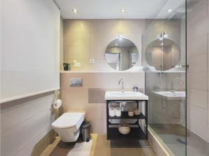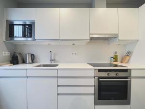 Nieruchomość składa się z jednej sypialni, salonu z częścią wypoczynkową i telewizorem oraz trzech łazienek wyposażonych w prysznice i suszarki do włosów. Goście mają do dyspozycji w pełni wyposażony aneks kuchenny obejmujący piekarnik, płytę grzewczą, lodówkę, zmywarkę, mikrofalówkę, toster oraz kompletny zestaw naczyń kuchennych. Dodatkowe udogodnienia to klimatyzacja, ogrzewanie, sprzęt do prasowania (żelazko i deska), biurko do pracy oraz szafa, zapewnione są ręczniki i pościel.