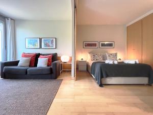 The apartment comprises one bedroom, a separate living room, and a private bathroom equipped with a shower, bidet, hairdryer, shampoo, and body soap. Guests can prepare meals in the fully equipped kitchen featuring an oven, stovetop, refrigerator, microwave, toaster, coffee machine as well as tea and coffee making facilities. Additional in-room amenities include bed linen, towels, heating and air conditioning units, ironing facilities with iron and board, washing machine, clothes drying rack, wardrobe, sofa seating area, flat-screen TV with bedside sockets.