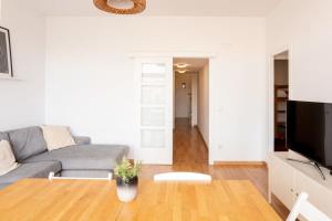 W pełni wyposażony aneks kuchenny zawiera piekarnik, płytę grzejną, lodówkę, zmywarkę do naczyń, mikrofalówkę oraz elektryczny czajnik wraz z przyborami do parzenia herbaty i kawy oraz naczyniami kuchennymi ułatwiającymi przygotowanie posiłków. Dodatkowe udogodnienia to telewizor ze streamingiem oraz bezprzewodowy internet dostępny we wszystkich pomieszczeniach. Patio z meblami ogrodowymi jest dostępne windą.